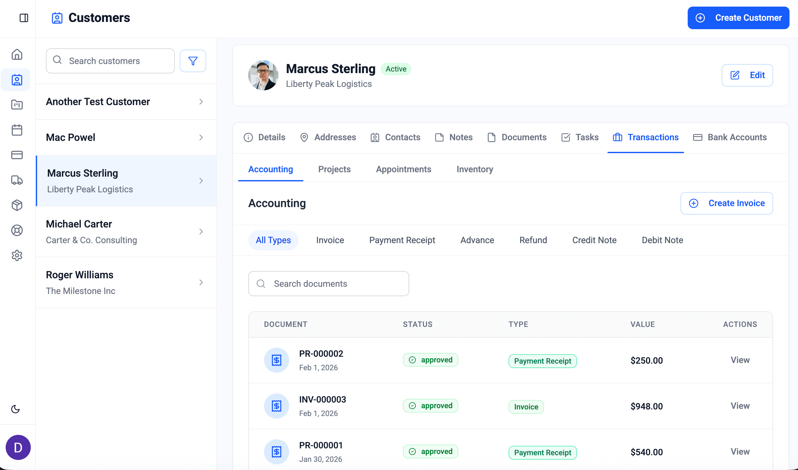 CRM for small business means one place for customers, contacts, and history—without enterprise complexity. In PrimeBase, your customer list connects to invoices, projects, and payments so you can run the full workflow from first contact to delivery. Unlike sales-only CRMs, PrimeBase keeps customers and vendors in the same system, so small teams get clarity without switching tools.