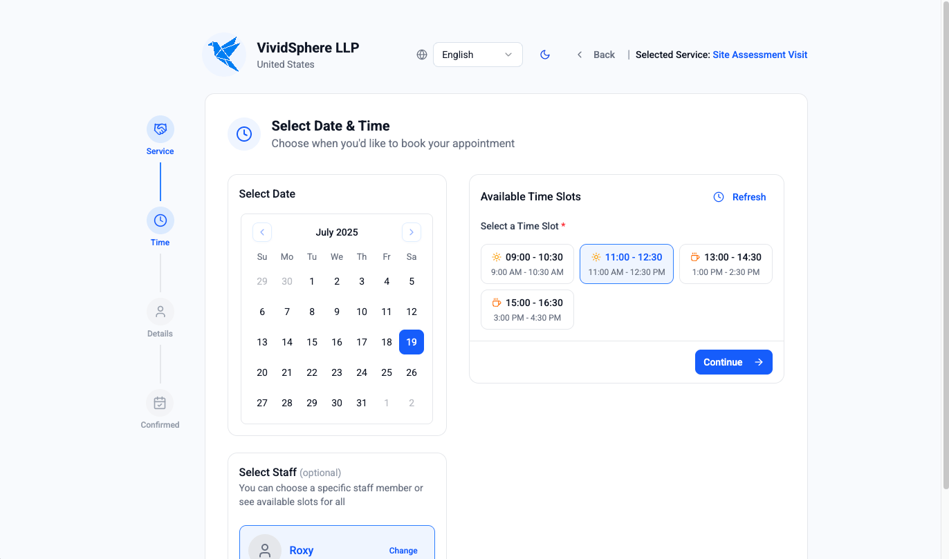 Define when each team member is available and what they offer. The booking page only shows open slots, so you avoid double-booking and manual scheduling. Updates to availability are reflected immediately for new bookings.